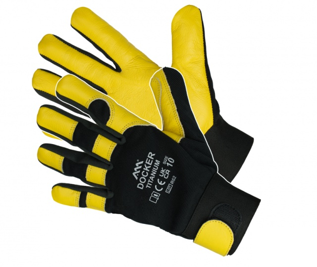 Mănuși de protecție, cu cinci degete, din piele de vacă, galbene de calitate superioară , cu tricot elastic cu spandex negru pe partea din spate . Caracteristică: - pielea de vacă boabe se caracterizează printr-o rezistență foarte mare la rupere și oferă o dexteritate excelentă, - mănuși din piele moale care asigură o bună aderență , - parte de prindere dintr-o bucată de piele, - partea superioara din tricotaje elastice negre cu spandex, - marginea superioară finisată cu o manșetă de cauciuc cu o închidere suplimentară cu velcro, care permite reglarea comodă a circumferinței la înălțimea încheieturii mâinii, - datorită cauciucului flexibil, mănușa nu alunecă în timpul lucrului și, în același timp, protejează împotriva contaminării, - partea superioară întărită cu piele pe degete, - dispunerea anatomică a degetului mare, - degetul arătător fără sudură la exterior, - calitate foarte înaltă a manoperei. Mănuși concepute pentru lucrul în toate industriile, perfecte pentru grădinărit, lucrări de asamblare și expediere.