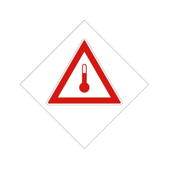 Caracterizarea pericolului Pericol de arsuri cauzate de caldura. Eticheta ADR in conformitate cu reglementarile UE pentru marcajul autovehiculelor care transporta marfuri periculoase. Dimensiuni 300 X 300 mm