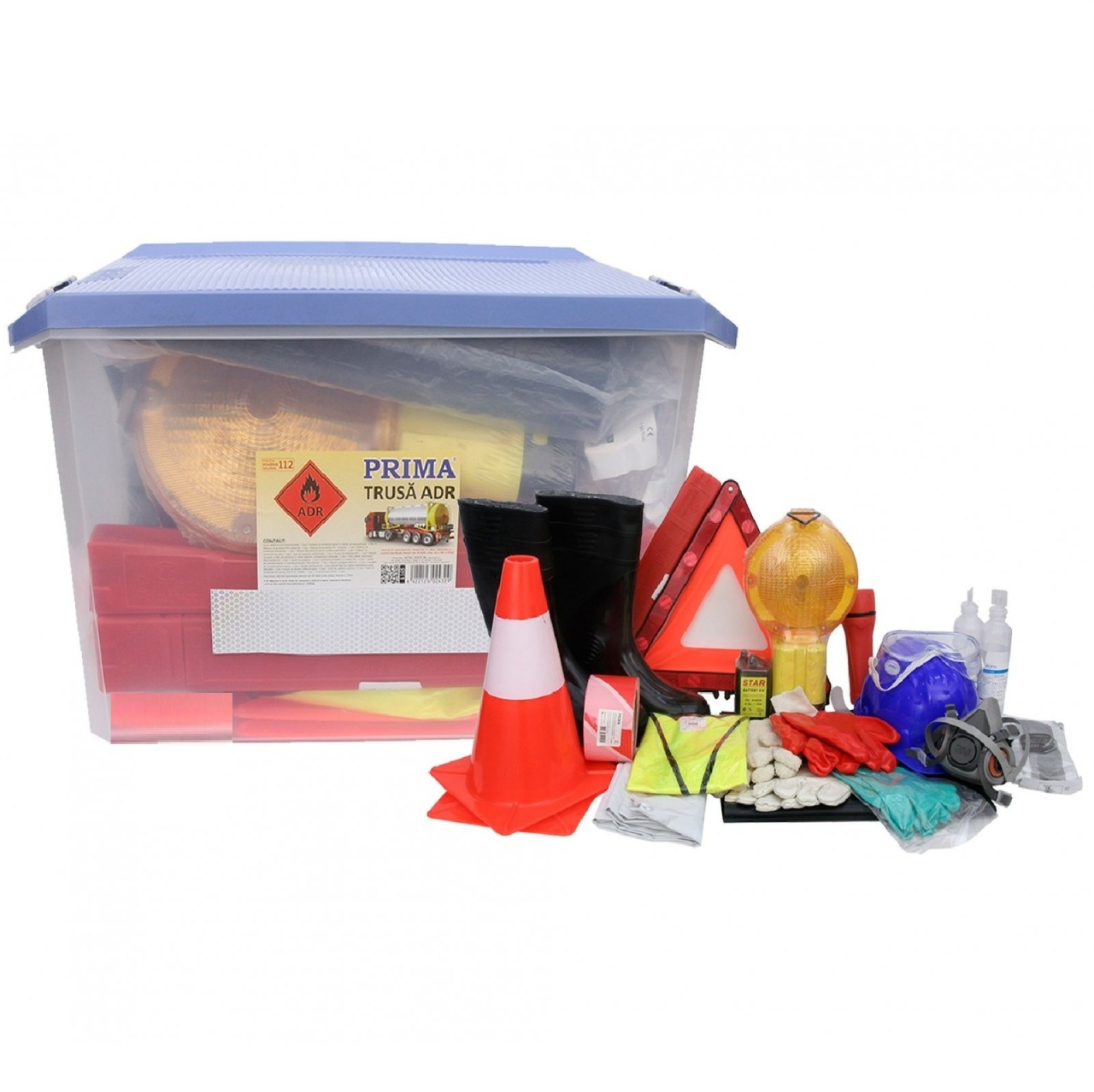 LIVRARE GRATUITA Trusa ADR este alcatuita conform cerintelor ACORDULUI EUROPEAN PRIVIND TRANSPORTUL DE MARFURI PERICULOASE (ADR) Garantie: 24 luni Componenta Sort de protectie antichimica Cizme de protectie Masca de gaze cu filtre de protectie in medii organice, anorganice si antiacide Casca de protectie Ochelari de protectie etansi Lanterna portabila cu baterii - 1 buc Trusa sanitara auto Banda avertizoare din polipropilena alb/rosu pentru delimitarea zonei afectate - 100 m Triunghiuri de presemnalizare avarie - 2 buc Conuri portocaliu reflectorizante h=300 mm - 2 buc Manusi de protectie anticalorice Manusi de protectie pentru produse petroliere Manusi de protectie din piele Lampa cu lumina galbena intermitenta cu alimentare proprie - 1 buc Covor de cauciuc Cutie trusa ADR din material plastic inscriptionata cu folie reflectorizanta Solutie pentru curatat ochii Manusi de protectie antiacide Vesta reflectorizant-fluorescenta Dimensiuni: 57cm x 39cm x 42cm