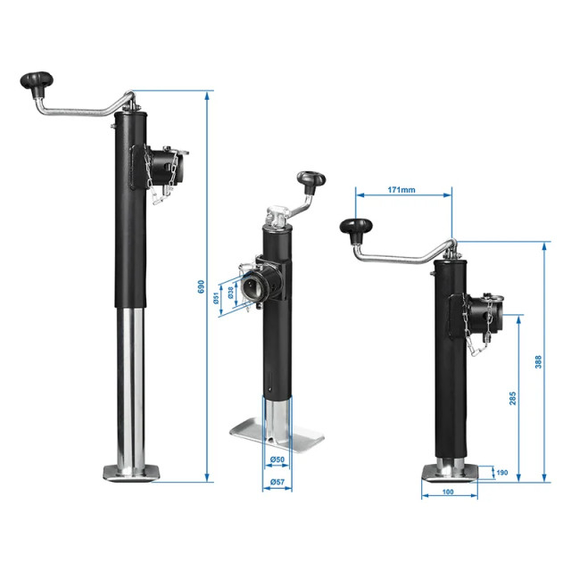 - Max. 1000 kg - Min. - Max. inaltime: 39-64 cm - Tub: Ø aprox. 57 mm - Dimensiuni placa de baza: aprox. 180x100 mm - Cu bobinator superior (nu detasabil) - Ajustabil si pivotabil - Incl. ac de siguranță - Incl. adaptor sudat - Material: otel galvanizat / vopsit cu pulbere