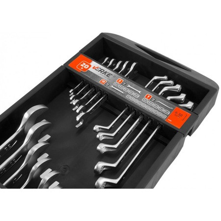 Chei combinate de înaltă calitate, fabricate din oțel crom-vanadiu. Concepute pentru utilizare atât acasă, cât și în ateliere profesionale. Acestea respectă standardele DIN 3113. Cheile au un finisaj satinat atractiv. Setul este ambalat într-o cutie convenabilă (casetă), deci ocupă puțin spațiu. Cuierul este fabricat dintr-un material foarte rezistent și durabil, iar orificiul din partea superioară permite agățarea pe perete.