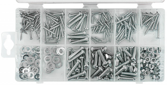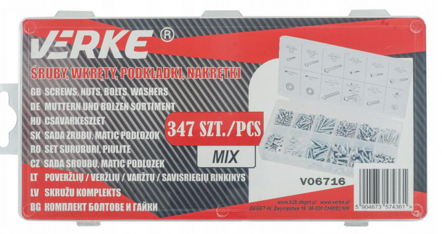 Set de 347 șuruburi și piulițe. Ambalat într-o cutie de plastic.