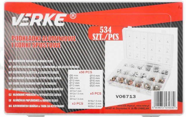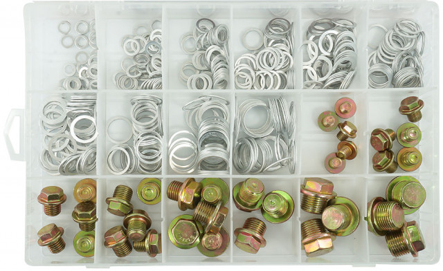 Un set de 534 șaibe și dopuri de scurgere a uleiului din aluminiu. Setul include dimensiuni de la 6 mm la 20 mm. Toate articolele sunt ambalate într-un ambalaj convenabil de tip „sortare”.