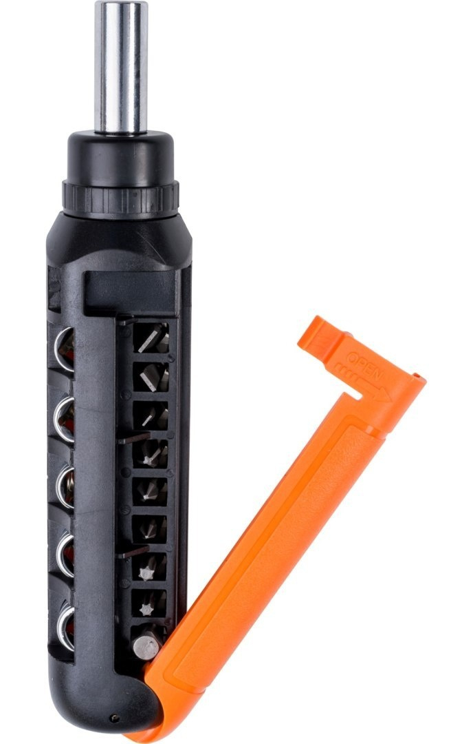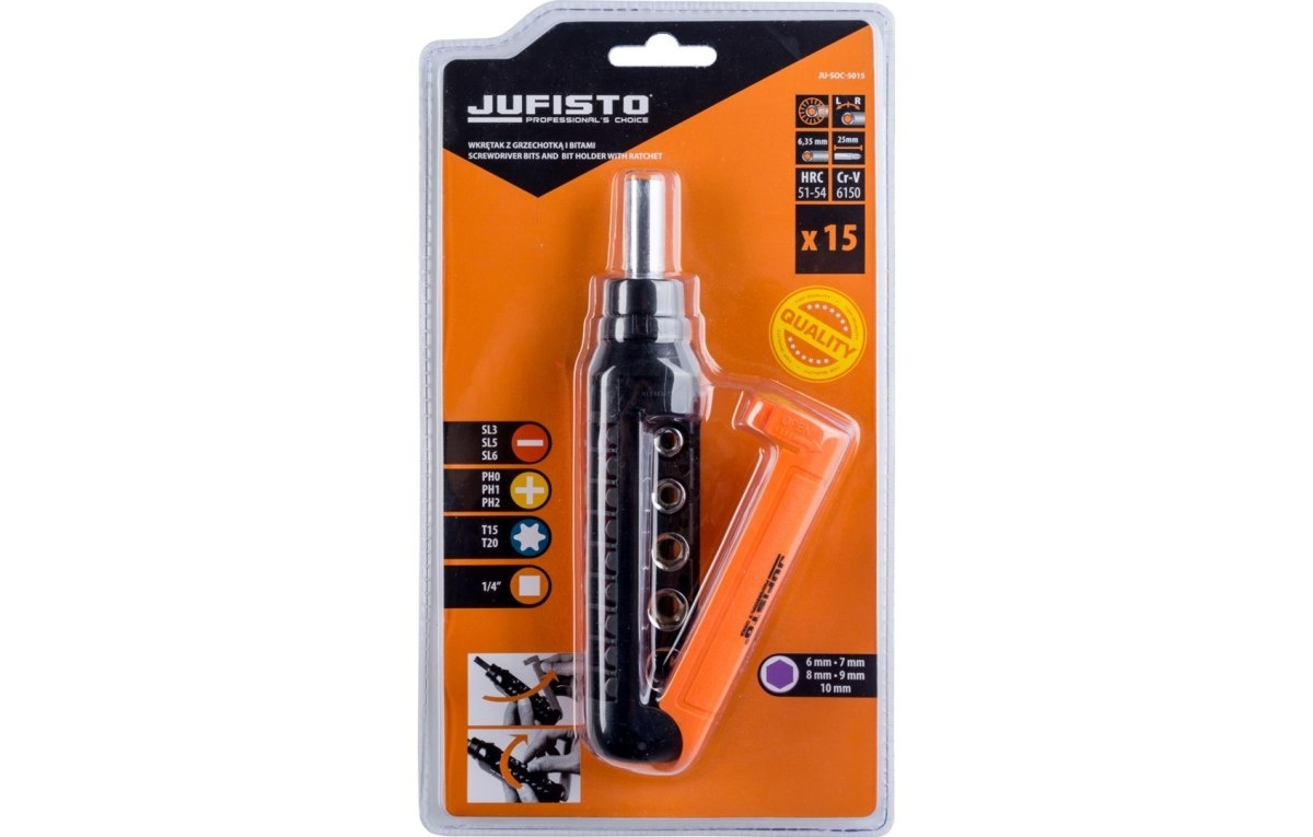 Material: Biți din oțel S2; Mâner: plastic, cauciuc Montare: 1/4" Conținut set: SL: 3mm, 5mm, 6mm Phillips PH0, PH1, PH2 HEX: H6; H7; H8; H9; H10 Torx: T10, T15, T20 Mâner în T din două componente cu prindere de 1" Aplicație: Înșurubare și slăbire șuruburi Descriere: Șurubelniță cu clichet cu biți interschimbabili, din oțel Cr-V 6150 de înaltă calitate. Clichet cu comutator înainte/înapoi și mecanism de blocare. Mânerul este fabricat din plastic confortabil, care se potrivește confortabil în mână și servește și ca compartiment pentru depozitarea biților.