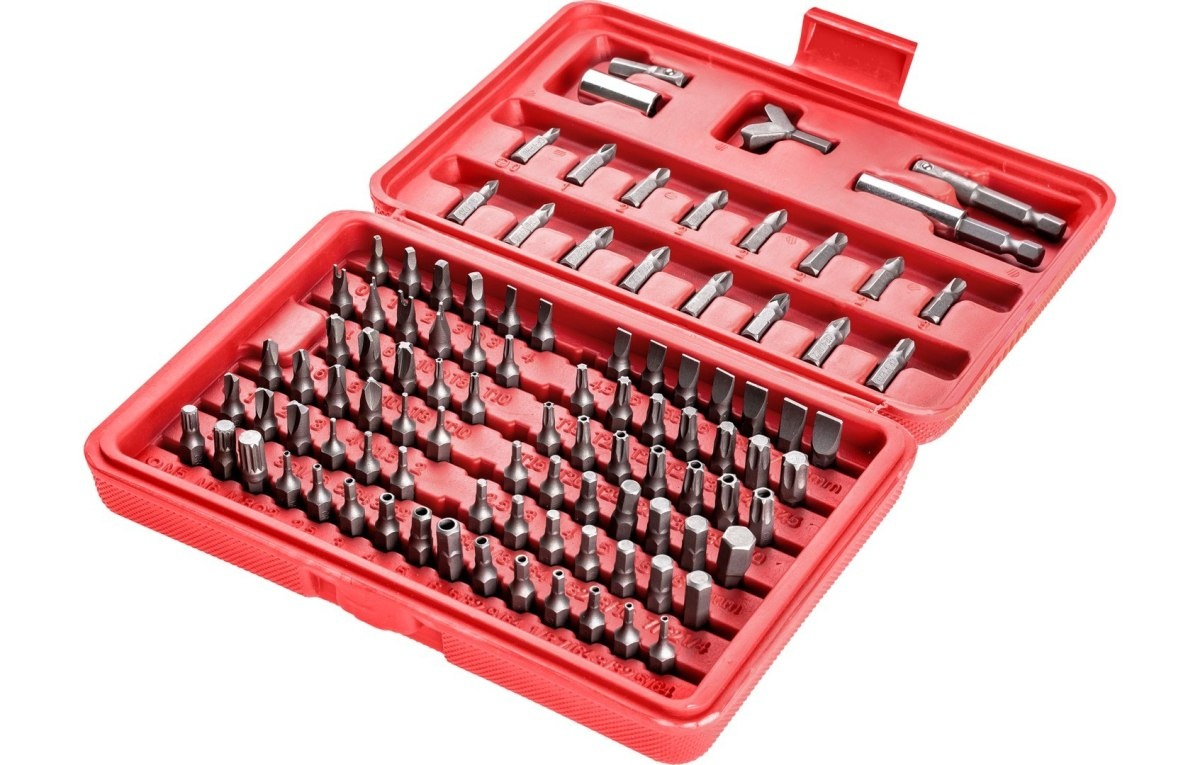 Biți pentru șuruburi sau bolțuri. Frezate, sablate și acoperite cu un strat anticoroziv. Forjate la rece din oțel CrV Material: Oțel CrV, plastic Montare: 1/4" Compoziție set: Lungime totală: 25 mm Setul conține: 100 de bucăți - (PH) 0, 1, 2, 2, 2, 2, 3, - (PZ) 0, 1, 2, 2, 2, 2, 3, - (PĂTRATE) 0, 1, 2, 3, - (PLATĂ) 3, 4, 4.5, 5, 5.5, 6, 6.5, 7, 8, - (FURCĂ) 4, 6, 8, 10, - (TORX) T8, T10, T15, T20, T25, T27, T30, T40, T45, - (EVENTAIL) 6, 8, 10, - (TORX CU GĂURĂ) T8, T10, T15, T20, T25, T27, T30, T35, T40, - (T) 1, 2, 3, 4, - (HEX) 1.5, 2, 2.5, 3, 4, 5, 5.5, 6, 8, - (DOUĂ PIESE) 1, 2, 3, - (HEX) 1/16"", 5/64"", 3/32"", 7/64"", 1/8"" 9/64"", 5/32"", 3/16"", 7/32"", 1/4"", - (CANELAT) M5, M6, M8, - (HEX CU GĂURĂ) 2, 2.5, 3, 4, 5, 6, - (HEX CU GĂURĂ) 5/32", 9/64", 1/8", 7/64", 3/32", 5/64"" - 1 suport magnetic - 4 extensii Aplicație: Set de biți cu șurubelniță și clichet. Informații suplimentare: Cutie cu compartimente din plastic pentru depozitarea biților