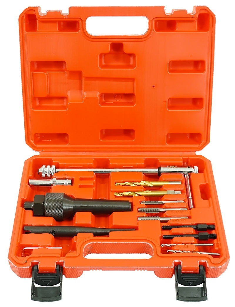 Setul contine: extractoare pentru bujii incandescente foarte puternic blocate 3 tarozi: M8 x 1.0, M10 x 1.0 si 6.3 mm (1/4") – 28UNF maner pentru filetare cu functie de clichet 2 burghie treptate: 7 x 5.5 mm si 9 x 5.5 mm suport pentru burghiu 2x burghiu 3.5 mm 2x pini de ghidare 6 x 3.5 x 40 mm cheie tubulara E10 ax hexagonal 12 mm piulita hexagonala 30 mm unealta de centrare